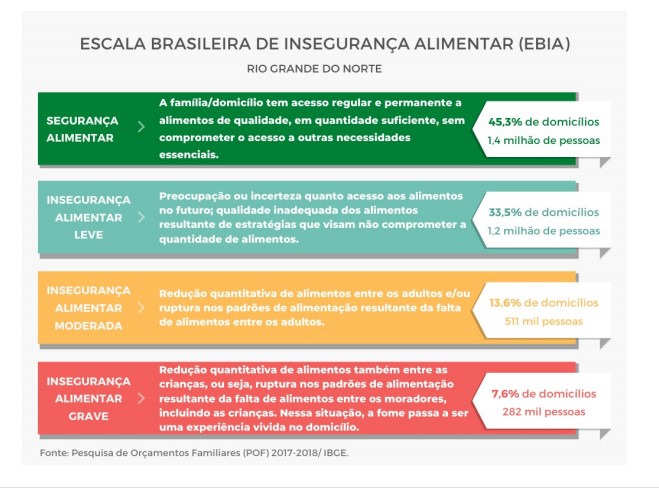 Em 2013 existiam 53 mil domicílios em situação de insegurança alimentar, o que equivalia a 5,1% da população total do Estado. Em 2018 esse número chegou a 81 mil, o que corresponde a 7,6% dos domicílios potiguares. Estima-se que ao menos 282 mil potiguares esteja em situação de insegurança alimentar grave.