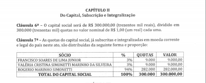 O capital social da empresa é R$ 300 mil sendo o ministro sócio majoritário com 94% do negócio.
