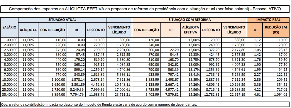 Nereu ainda acrescenta que a alíquota proposta pelo Governo do Estado é progressiva (ver acima). “Nem todo mundo vai pagar em cima do salário total, mas em partes variadas. “Quem ganha até R$ 10 mil, por exemplo, paga 12% até o valor de R$ 3 mil e o restante em 13%”, explicou.