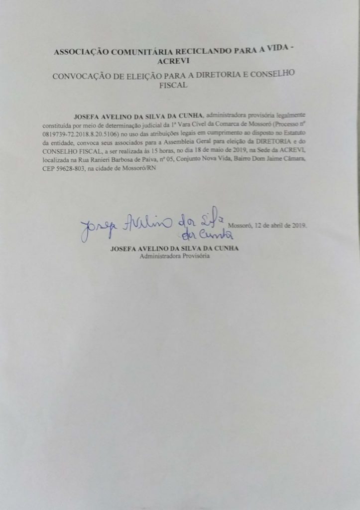A Associação Comunitária Reciclando para a Vida (ACREVI) anuncia para o dia 18 de maio, às 15h, a realização de assembleia para eleger a nova direção e o conselho fiscal da entidade.