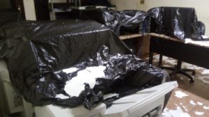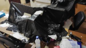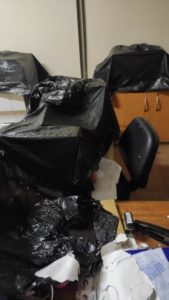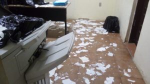 A situação piorou com as chuvas por causa das goteiras. Foi necessário colocar sacos de lixo para cobrir os computadores e evitar um possível incêndio por falta de segurança na parte elétrica. Os relatos feitos apontam que faltam tomadas e os equipamentos funcionam por meio de gambiarras.