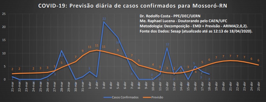 O professor da UERN ainda estimou a evolução de casos da covid-19 em Mossoró com um espaçamento de datas menor. Nas contas dele serão 33 novos casos confirmados na capital do Oeste até o dia 25 de abril. Somando-se aos 104 anunciados hoje seriam 137.