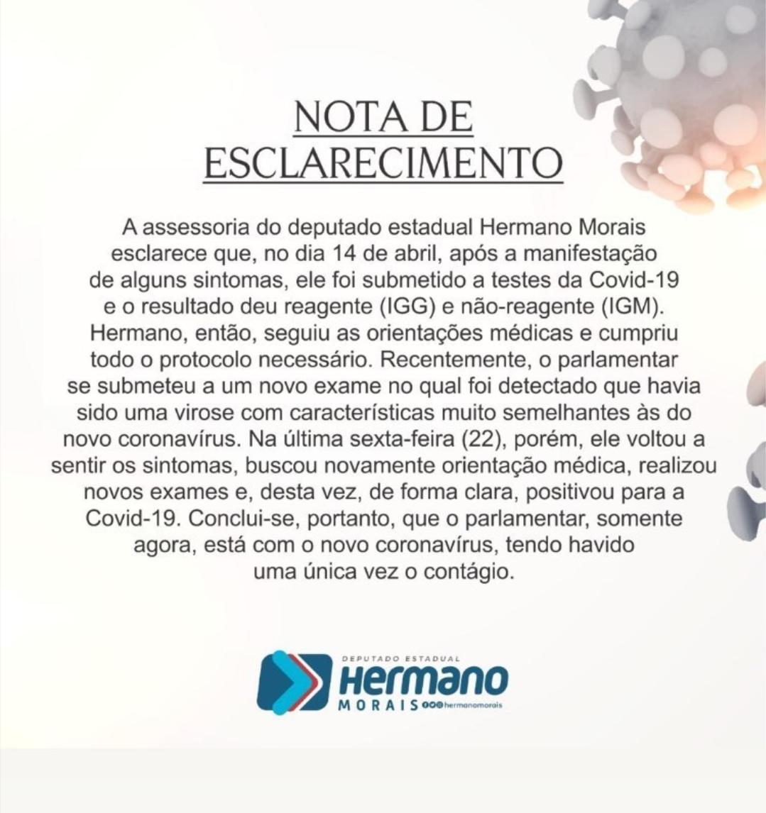 O deputado estadual Hermano Morais (PSB) anunciou nas redes sociais hoje que está internado com diagnóstico de covid-19. Como ele foi acometido pela doença em abril logo se conclui que ele estaria com a doença pela segunda vez.