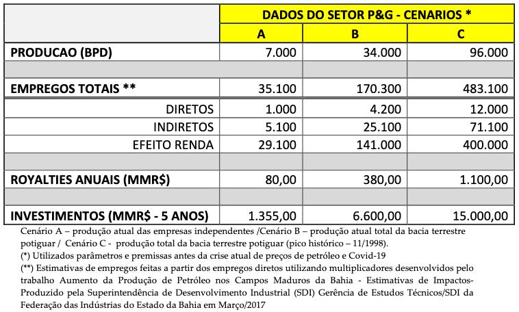 Um estudo desenvolvido pela Federação das Indústrias da Bahia (FIEB) e comentado em artigo assinado pelo secretário executivo da Associação Brasileira de Produtores Independentes de Petróleo e Gás (ABPIP), Anabal Santos Jr., mostra cenários distintos em relação à produção de barris de petróleo por dia e seu rebatimento na geração de empregos, royalties e investimentos (tabela abaixo). Os números são importantíssimos para debelar a ideia que chegamos ao fim da indústria do petróleo em nosso Estado. Pelo contrário, sugere o renascimento, obviamente, de forma mais comedida de como foi no passado.