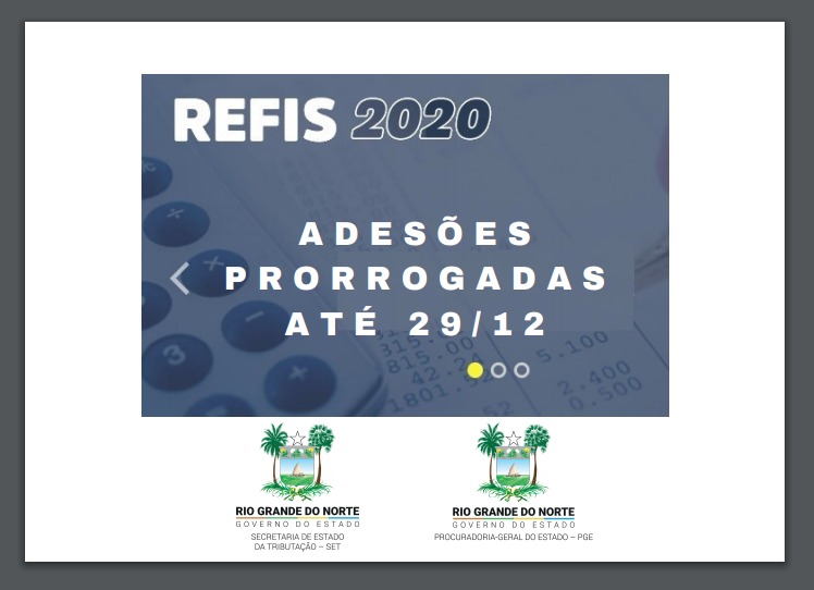 Quem perdeu o prazo ainda tem a chance de aproveitar os benefícios proporcionados pelo programa. Basta acessar a página https://refis2020.set.rn.gov.br/ e fazer clicar em uma das duas opções ‘Débitos Fiscais’ ou ‘Divida Ativa’.