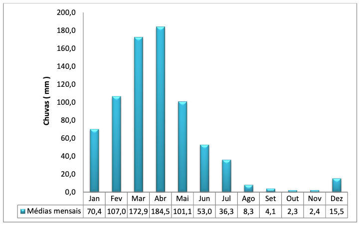 Essa concentração, quando se observa a série histórica, na figura abaixo, de 1970 a 2013 (Silva, 2014), fica claro que a maior incidência de chuvas acontece entre os meses de janeiro a julho, com destaque para os meses de fevereiro a maio, quando os índices pluviométricos ficam acima dos 100mm.