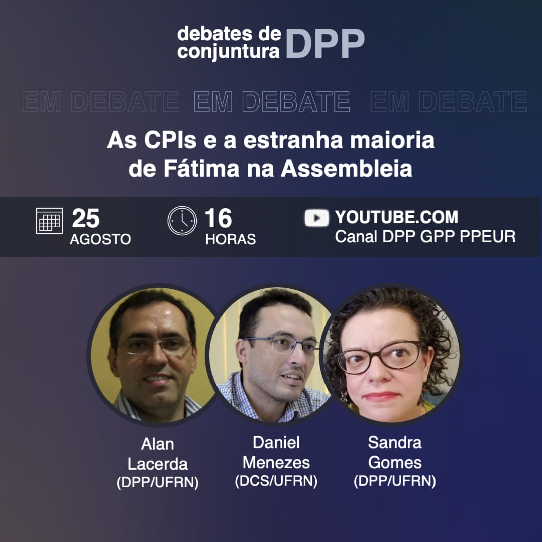 O tema será “As CPIS e a estranha maioria de Fátima na Assembleia”. Os debatedores serão os professores Alan Lacerda, Daniel Menezes e Sandra Gomes, todos da UFRN.