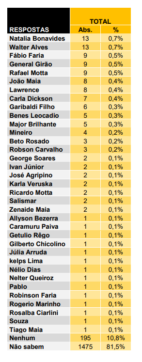O instituto AgoraSei! ouviu 1800 eleitores de todas as regiões do Rio Grande do Norte entre os dias 28 e 31 de agosto. A margem de erro é de 2,3 pontos percentuais para mais ou para menos. O intervalo de confiança é de 95%.