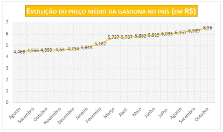 O preço do litro da gasolina no País subiu 3,98% em outubro na comparação com setembro, chegando a um valor médio no País de R$ 6,56. Após um ano e cinco meses de altas consecutivas, o valor do combustível acumula um aumento de 63,6% desde maio do ano passado, dois meses após o começo da pandemia, quando o preço médio era de R$ 4,01.