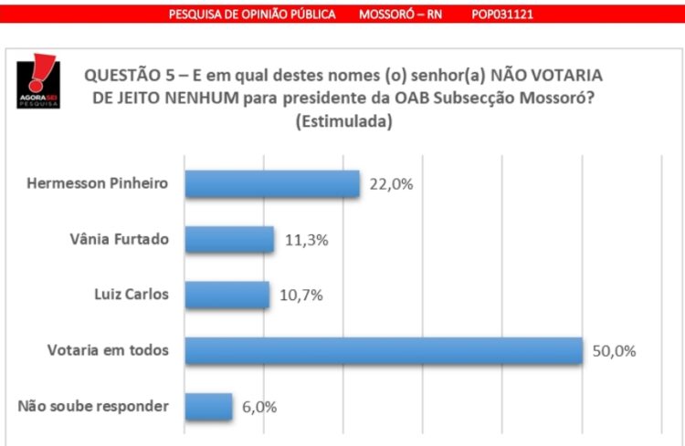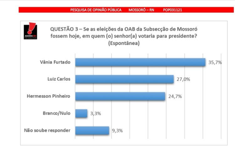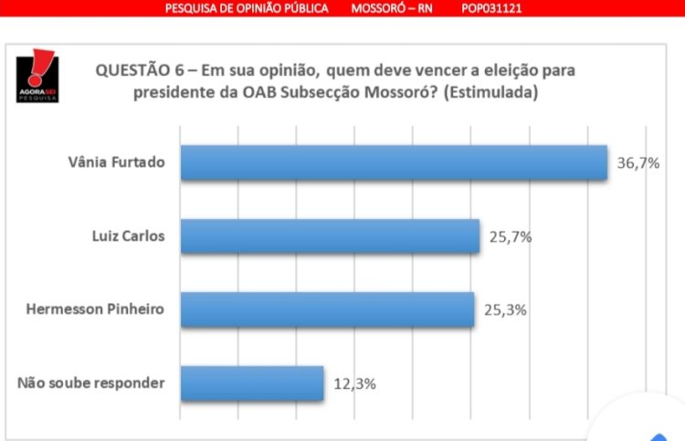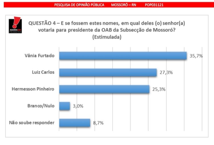 O Instituto AgoraSei ouviu 300 advogados entre os dias 17 e 18 de novembro nas cidades de Mossoró, Apodi, Areia Branca e Caraúbas. A pesquisa tem margem de erro de 5.1 pontos percentuais para mais ou para menos e o intervalo de confiança é de 95%.