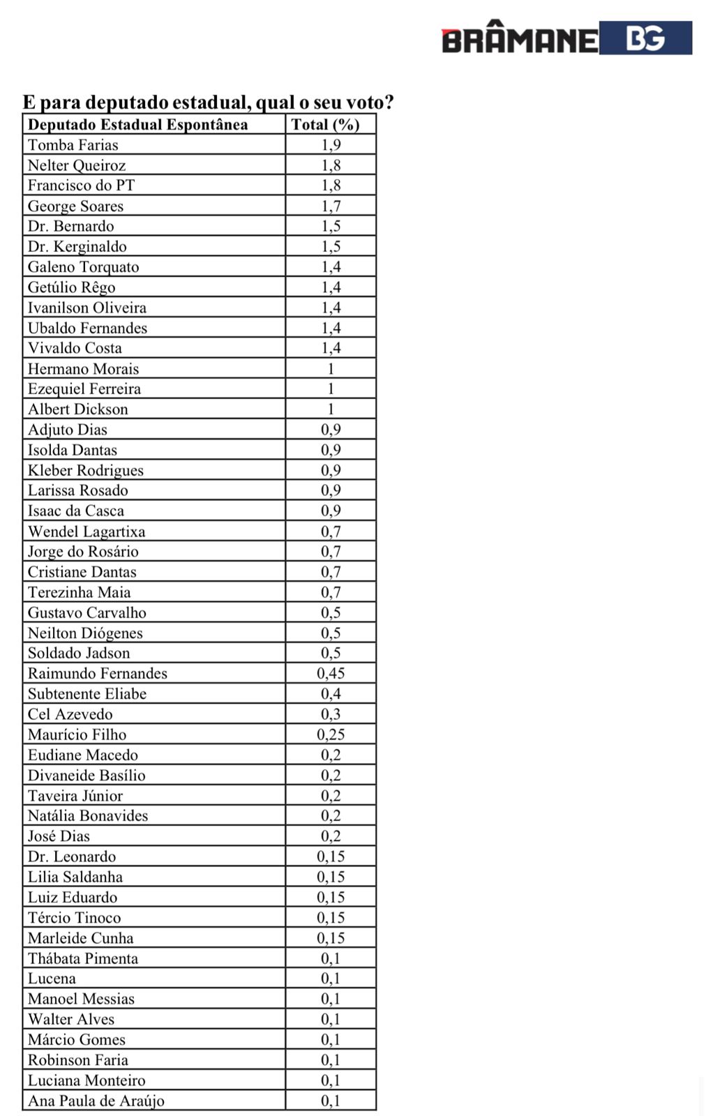 O deputado estadual Tomba Farias (PSDB) foi o nome mais citado para a Assembleia Legislativa na pesquisa Brâmane divulgada hoje pelo Blog do BG.