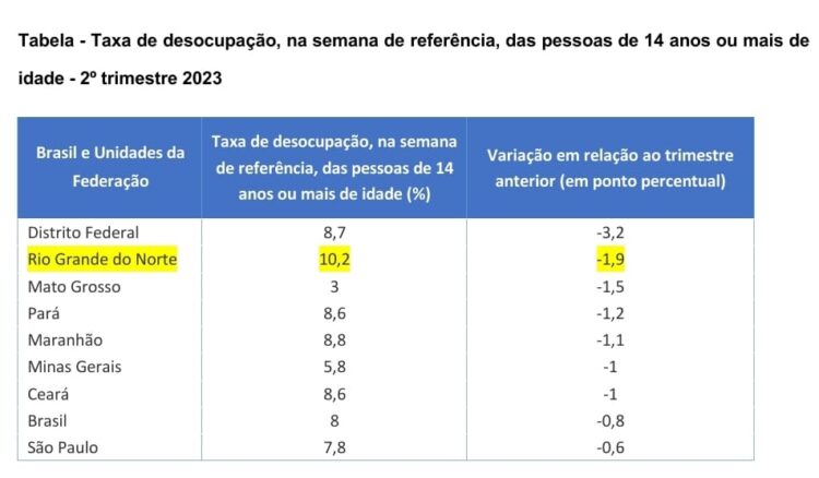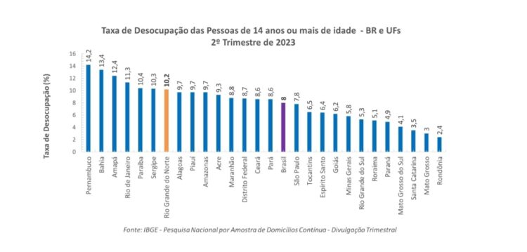 Dentre as sete maiores taxas de desocupação no país, cinco são de estados do Nordeste, tendo Pernambuco a maior taxa (14,2%), seguido pela Bahia (13,4%). O RN ficou com a sétima maior taxa do país (10,2%).