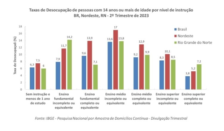 A taxa de desocupação para as pessoas com ensino fundamental incompleto ou equivalente (14,2%) foi maior que as taxas dos demais níveis de instrução analisados, seguida pelo grupo de pessoas com ensino médio incompleto ou equivalente (13,8%). Para as pessoas com nível superior incompleto, a taxa foi de 8,5%, enquanto para o nível superior completo, 7,2%. Nacionalmente e regionalmente, as taxas de desocupação para o nível superior completo são consideravelmente menores, 3,8% e 5,2%, respectivamente.