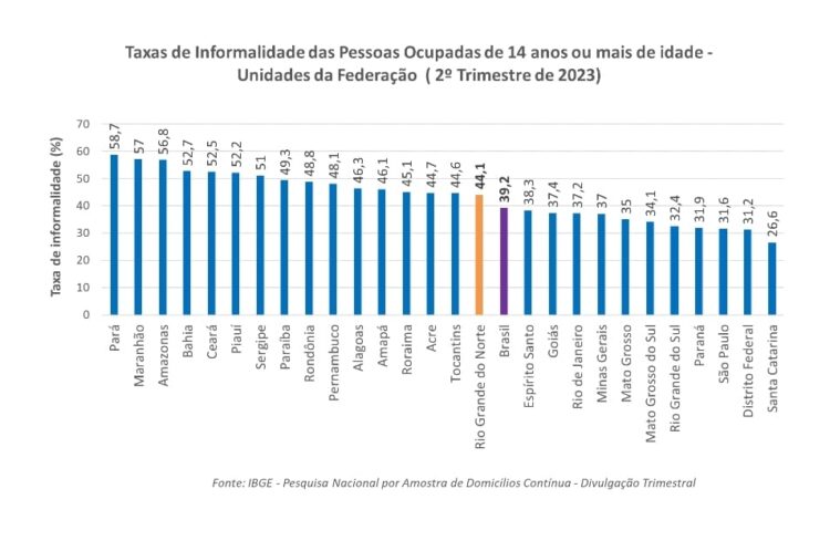 A taxa de informalidade para o Rio Grande do Norte no 2º trimestre de 2023 variou negativamente em 1,8%, saindo dos 45,9% no primeiro trimestre para 44,1% no segundo. A média nacional foi de 39,2%, sendo as maiores a dos estados do Pará (58,7%), Maranhão (57,0%) e Amazonas (56,8%), e as menores, as de Santa Catarina (26,6%), Distrito Federal (31,2%) e São Paulo (31,6%). Das 1,3 milhões de pessoas ocupadas do estado, 587 mil são trabalhadores informais. No trimestre passado eram 598 mil pessoas na condição de informalidade.
