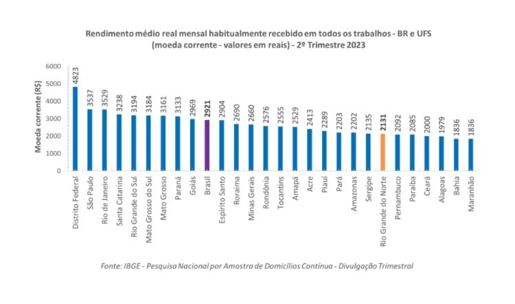 O rendimento médio real mensal habitualmente recebido em todos os trabalhos no RN caiu R$ 24,00 se comparado ao último trimestre, indo para R$ 2.131,00. De janeiro a março de 2023, esse valor havia sido de R$ 2.155. Já a média nacional para o segundo trimestre foi de R$ 2.921,00. O Rio Grande do Norte teve o terceiro maior rendimento do Nordeste (R$ 2.131,00) no segundo trimestre, ficando atrás do Piauí (R$ 2.289,00) e de Sergipe (R$ 2.135,00). Bahia e Maranhão apresentaram os menores rendimentos da Região, R$ 1.836,00 para ambos os estados.