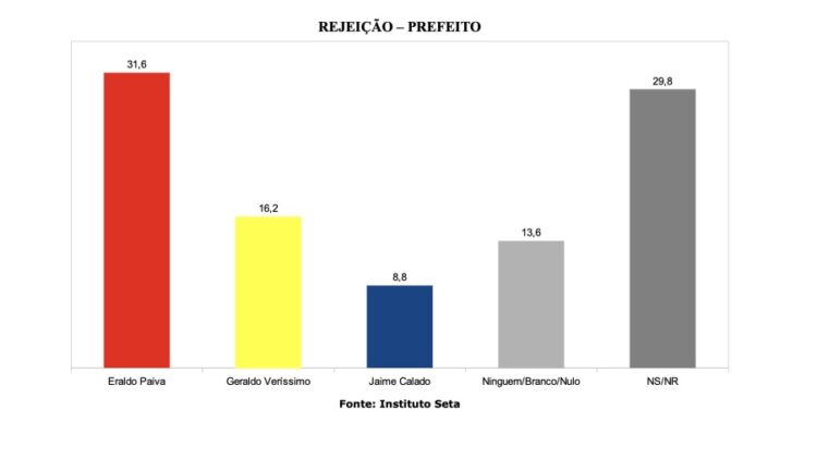 No quesito rejeição, o atual prefeito Eraldo é o mais rejeitado com 31,6% e Geraldo Veríssimo 16,2%. Jaime Calado está com 8,8% de rejeição. Outros 13,6% afirmaram que sobre rejeição colocariam branco, nulo ou ninguém. 29,8% não sabe ou não respondeu.