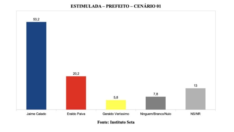 O prefeito Eraldo Paiva (PT) soma 20,2% seguido por Geraldo Veríssimo (PP) com 5,8%. Declararam votar nulo 7,8%, em ninguém ou branco e outros 13% não sabem ou não responderam.