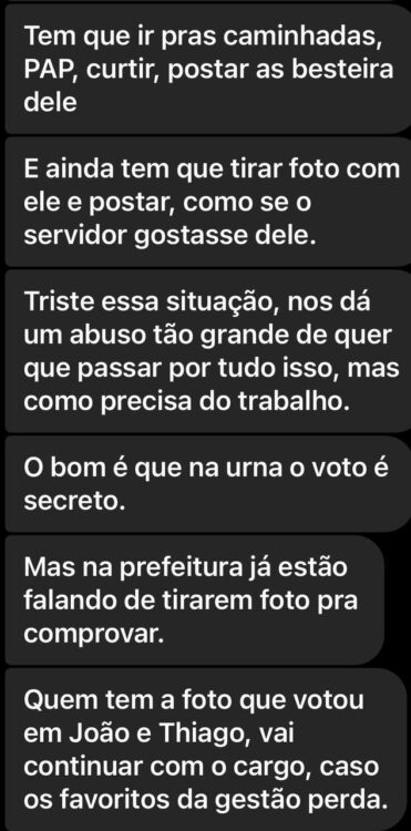 A pressão ainda passa pela necessidade de além de ir as caminhadas, tirar fotos com os candidatos e postar nas redes sociais, curtir tudo que ele posta e fingir que gosta dos nomes do prefeito. Também se fala na necessidade de tirar foto do voto na urna.