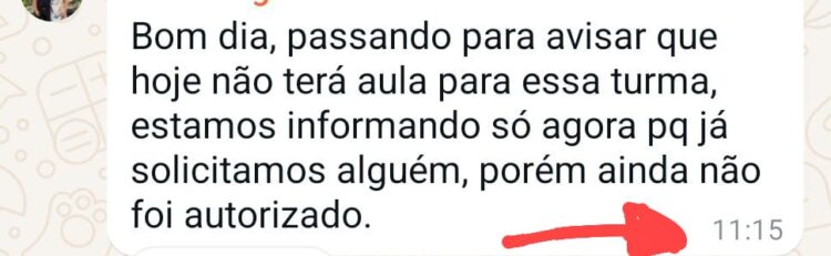 Ela também comenta que outro problema é que o aviso sobre as faltas de professores é feito em cima da hora, desorganizando a rotina e dinâmica das famílias. Ela nos enviou um print de um grupo da UEI comprovando a desorganização. Na mensagem o eviso sobre a falta da professora é feito às 11h15 sendo que as aulas tem início às 13h.