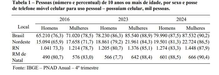 No Rio Grande do Norte, 2,7 milhões de pessoas com 10 anos ou mais de idade possuíam telefone móvel, equivalente a 85,7% dessa população. Quando à posse de telefone celular para uso pessoal, por sexo, observou-se que houve expansão entre homens e mulheres no Rio Grande do Norte. Em 2024, 83,3% dos homens e 87,9% das mulheres possuíam celular, frente a 73,3% e 78,7%, respectivamente, em 2016.