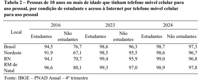O uso da internet pelo celular alcançou quase a totalidade dos usuários no RN. Em 2024, 99% dos estudantes e 96,8% dos não estudantes com celular acessaram a internet por meio do aparelho.