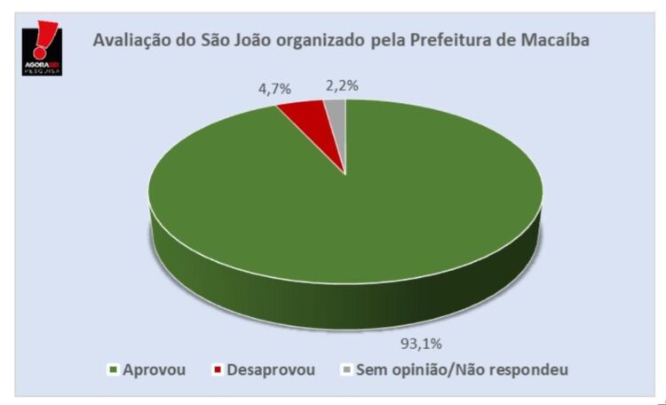 O São João do Povo 2025 foi aprovado por 93,1% dos macaibenses. O dado foi apurado pelo instituto AgoraSei , que entrevistou 1 mil pessoas, no período de 15 a 18 de julho, nos mais diversos bairros e comunidades, das zonas urbana e rural de Macaíba.