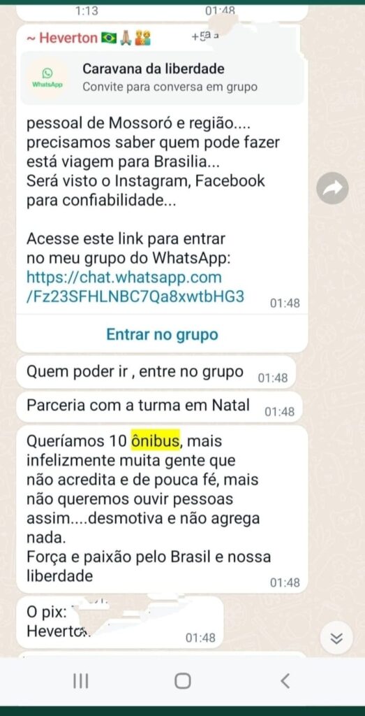 Através de conversas em grupos de Whatsapp, um mossoroense pedia para que bolsonaristas apoiassem tanto comparecendo a Brasília, quanto enviando PIX par custear caravanas em direção a capital. O técnico em segurança, Herverton Cavalcante, postou convites para integrar um grupo na rede de mensagens instantâneas “Caravana da Liberdade”, afirmando o seguinte: “Pessoal de Mossoró e região, precisamos saber quem pode fazer esta viagem para Brasília”.