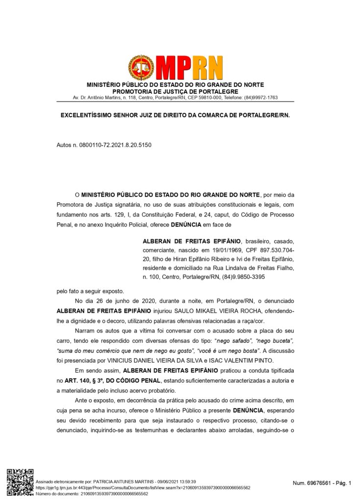 Consta na denúncia, assinada pela promotora de Justiça Patrícia Nunes Martins, que no dia 26 de junho de 2020 o comerciante se envolveu numa discussão com Saulo Mikael Vieira Rocha, oportunidade em que teria proferido as seguintes frases: