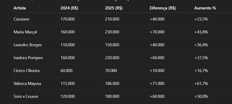 Aumento dos cachês dos artistas que tocaram Mossoró Sal & Luz de 2024 e 2025: