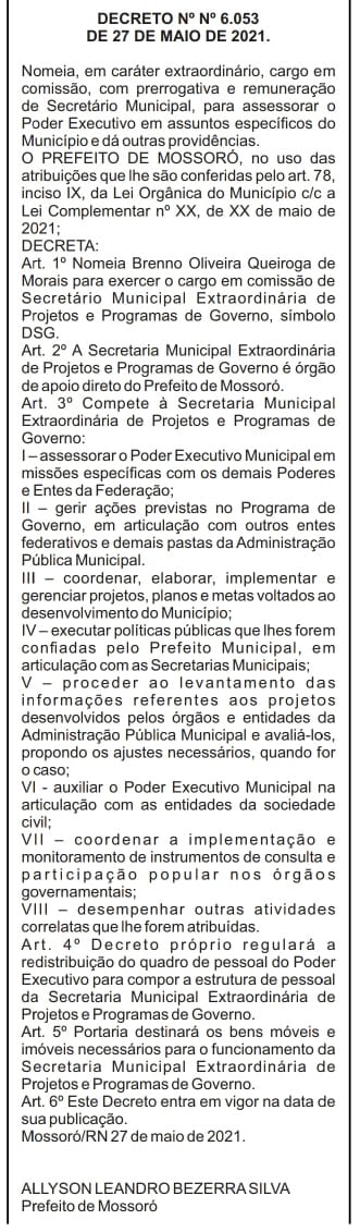 Com a possibilidade de criar até secretarias extraordinárias autorizada pela Câmara Municipal o prefeito Allyson Bezerra (SD) criou, via decreto, a Secretaria Municipal Extraordinária de Projetos e Programa de Governo.