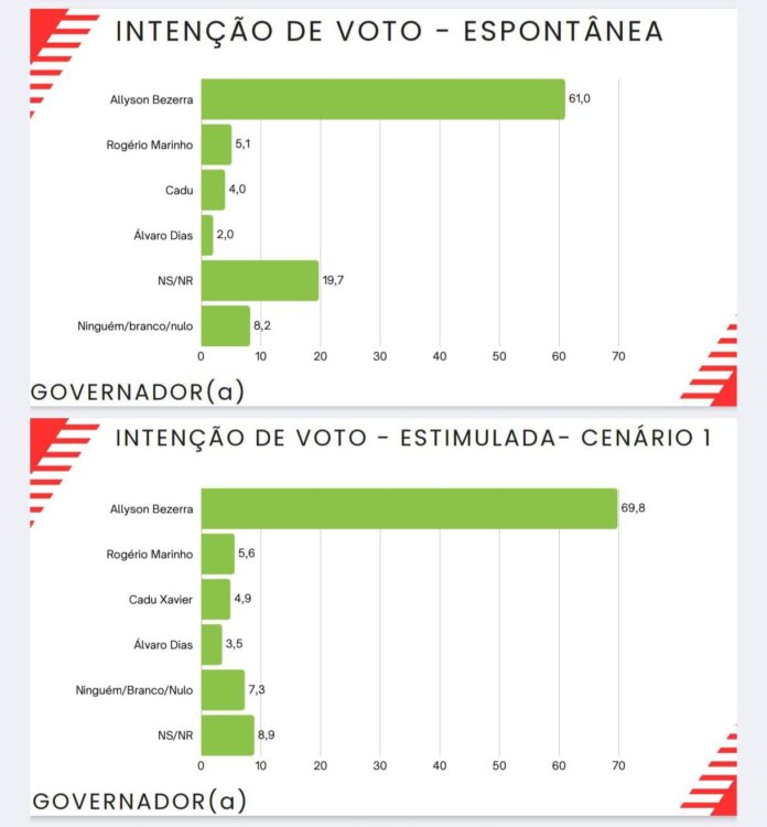 A pesquisa do Instituto Seta, realizada com eleitores de Mossoró, indica um cenário de forte vantagem do prefeito Allyson Bezerra na disputa pelo Governo do Rio Grande do Norte. Na intenção de voto espontânea, Allyson aparece com 61%, demonstrando alto grau de lembrança e consolidação eleitoral no município. Bem atrás surgem Rogério Marinho (5,1%), Cadu (4,0%) e Álvaro Dias (2,0%). Os índices de NS/NR (19,7%) e ninguém/branco/nulo (8,2%) finalizam o balanço colhido.