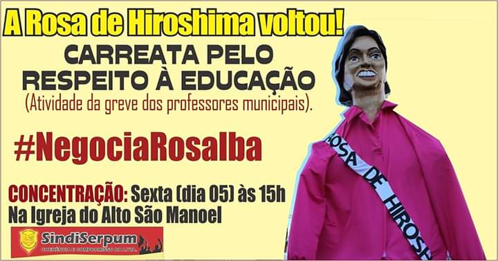 Além do entendimento pelo prosseguimento da greve, foi elaborado um calendário com as atividades desta semana e a boneca “Rosa de Hiroshima”, que estreou nas ruas durante “O Pingo do Mei Dia” do ano passado, voltará em uma carreata agendada para a próxima sexta-feira (dia 05), saindo da igreja do Alto de São Manoel, a partir das 15h e percorrerá alguns bairros da cidade.