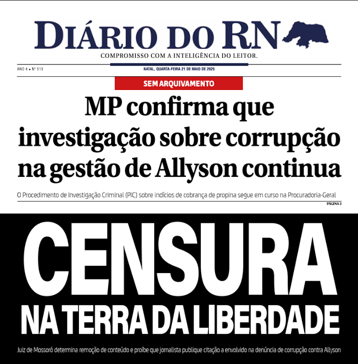 O Diário do RN publicou em sua capa de hoje (21) que a investigação contra o prefeito de Mossoró Alyson Bezerra continua. Além disso, se solidarizou com o blog do barreto, autor das postagens, pela decisão judicial que mandou o blog retirar as matérias sobre investigação acerca de suspeitas de corrupção envolvendo o prefeito de Mossoró do ar.