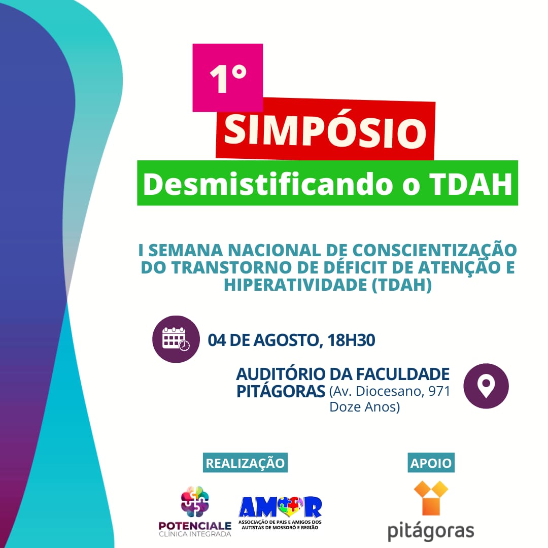 A Associação de Pais e Amigos dos Autistas e TDAH de Mossoró e Região – ASSOCIAÇÃO AMOR em parceria com a Potenciale Clínica Integrada e apoio da Faculdade Pitágoras organizam o I Simpósio desmistificando o TDAH com a participação de diversos profissionais para discutir sobre esse transtorno do neurodesenvolvimento.