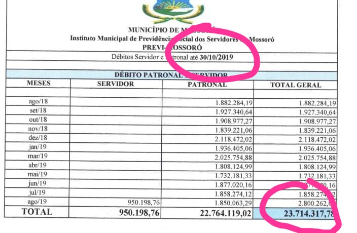 A Prefeitura de Mossoró segue sem cumprir os compromissos com o Instituto de Previdência Social dos Servidores de Mossoró (PREVI-Mossoró) chegou a R$ 23.714.317,78.