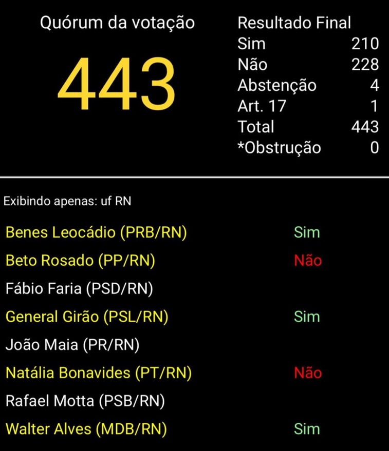 Se ausentaram da votação Fábio Faria (PSD), João Maia (PR) e Rafael Motta (PSB).