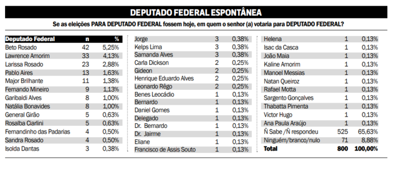 O segundo mais citado é o presidente da Câmara Municipal Lawrence Amorim (SD), seguido pela vereadora Larissa Rosado (União) – ela tenta vaga na Assembleia Legislativa – pelo vereador Pablo Aires (PSB).