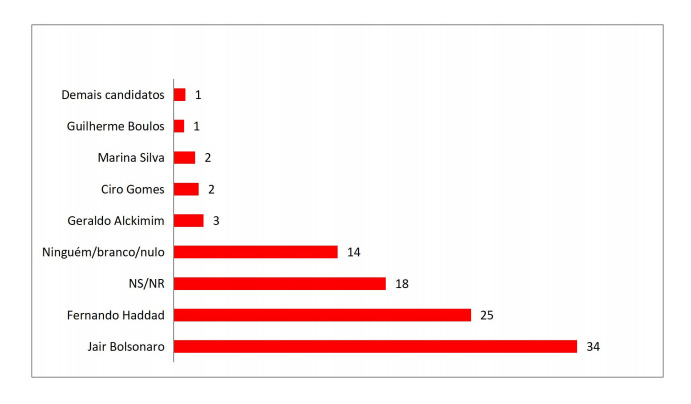 Ele tinha 26% em 4 de outubro e agora aparece com 29% enquanto Fernando Haddad (PT) que tinha 30% caiu para 25%. Cirou Gomes (PDT) oscilou positivamente de 11% para 13%.