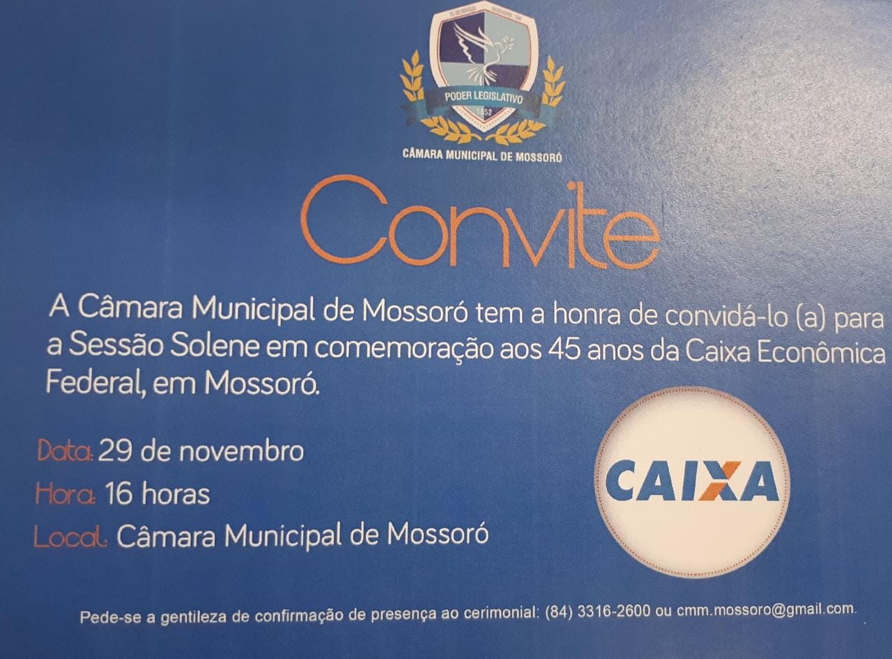 A Câmara Municipal de Mossoró celebrará os 45 anos da Caixa Econômica Federal na cidade, quinta-feira (29), às 16h, no plenário da Casa. A sessão solene homenageará servidores do banco, ativos e aposentados, em reconhecimento à contribuição de cada um com o município.