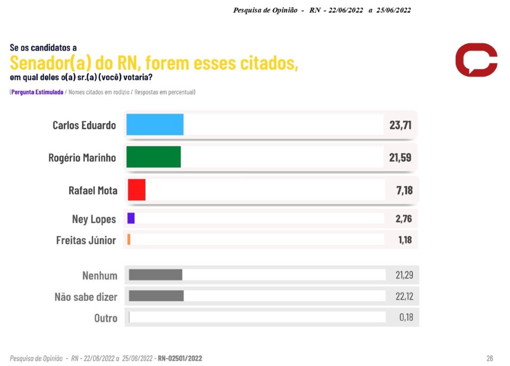 O ex-prefeito de Natal Carlos Eduardo Alves (PDT) e o ex-ministro do desenvolvimento regional Rogério Marinho (PL) estão tecnicamente empatados segundo os números levantados pelo Instituto Consult em parceria com a TV Ponta Negra.
