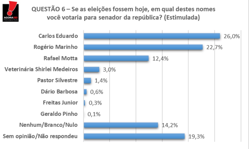 O ex-prefeito Carlos Eduardo Alves (PDT) cresceu 2,3 pontos percentuais em relação a pesquisa anterior do Instituto AgoraSei e ampliou um pouco a vantagem que tem sobre o ex-ministro Rogério Marinho (PL) que também cresceu, mas um ponto a menos que os adversários.