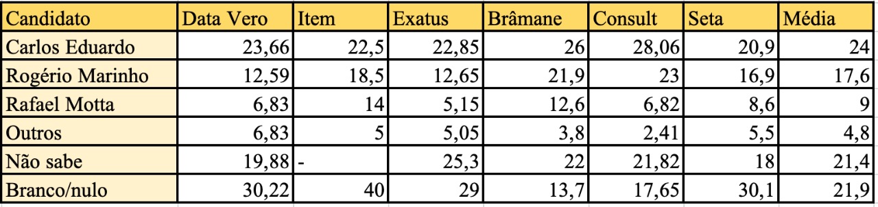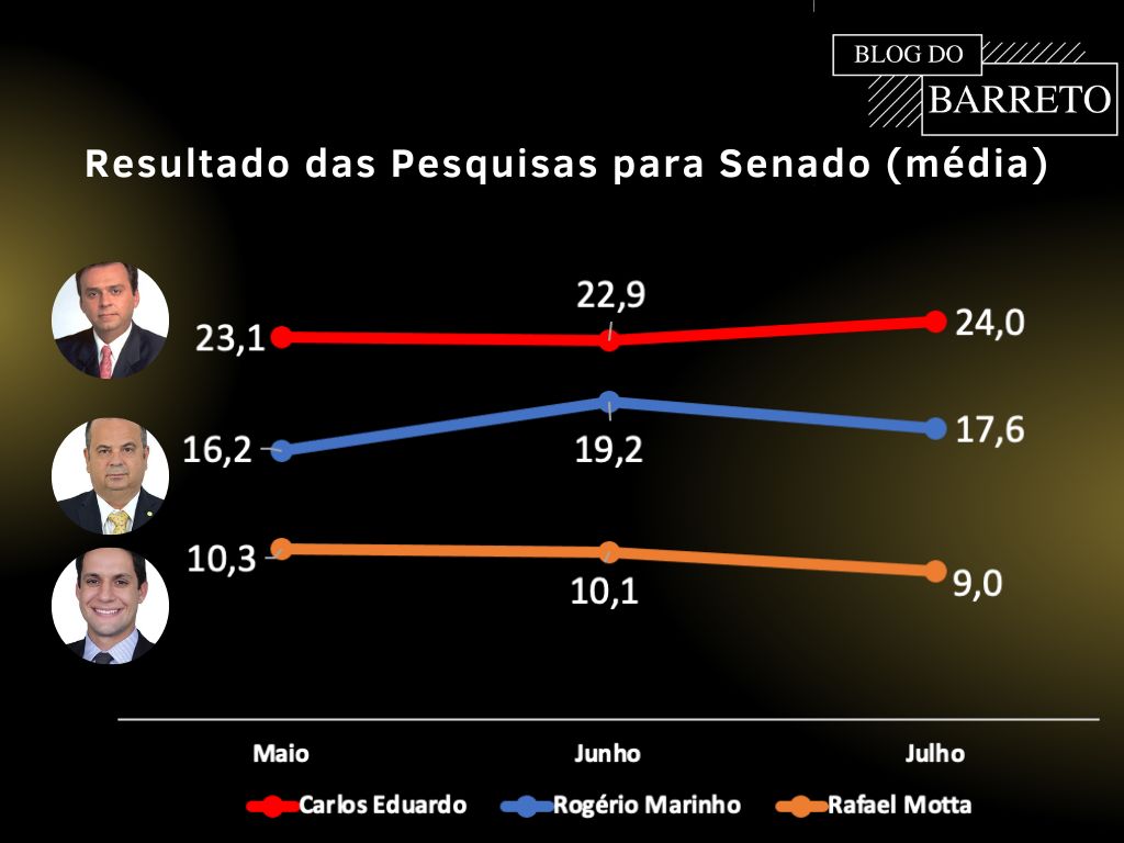 Carlos Eduardo liderou todas as seis pesquisas realizadas em julho sendo a maior diferença na Data Vero (11 pontos) e a mais próxima próximas Consult e Seta com 4,1 e 4 pontos de diferença.