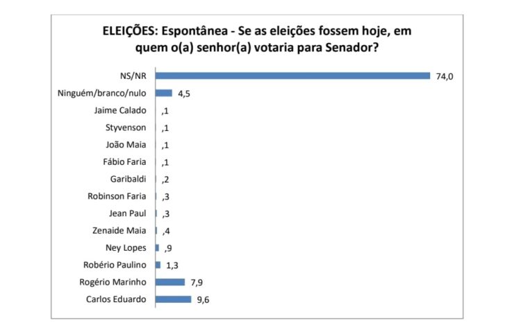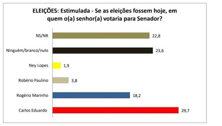 O ex-prefeito de Natal Carlos Eduardo Alves (PDT) segue a frente do ex-ministro Rogério Marinho (PL) na corrida ao Senado de acordo com os números da pesquisa Seta/Band divulgada nesta sexta-feira.