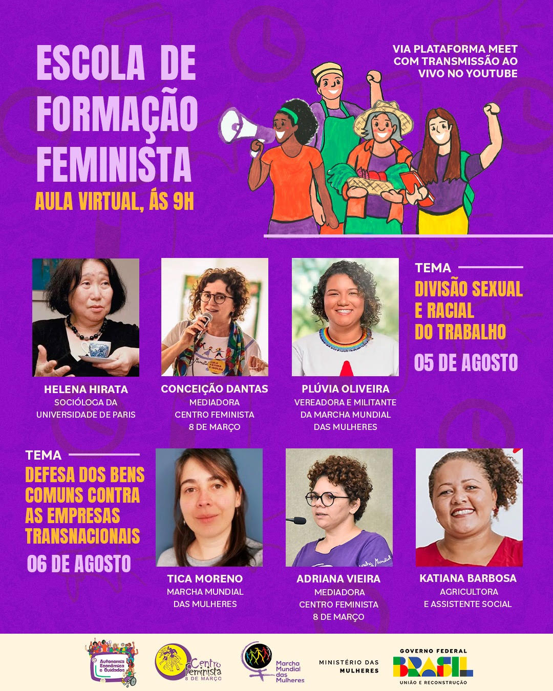 Já no dia 6 de agosto, a aula abordará o tema “Defesa dos bens comuns contra as corporações transnacionais: justiça climática, luta contra a mineração e os impactos da energia eólica e solar”. A discussão faz parte das atividades de mobilização da 6ª Ação Internacional da Marcha Mundial das Mulheres, neste ano de 2025. Estarão presentes Tica Moreno, militante da Marcha Mundial das Mulheres, e Katiana Barbosa, agricultora e assistente social. A mediação será conduzida por Adriana Vieira, do CF8.