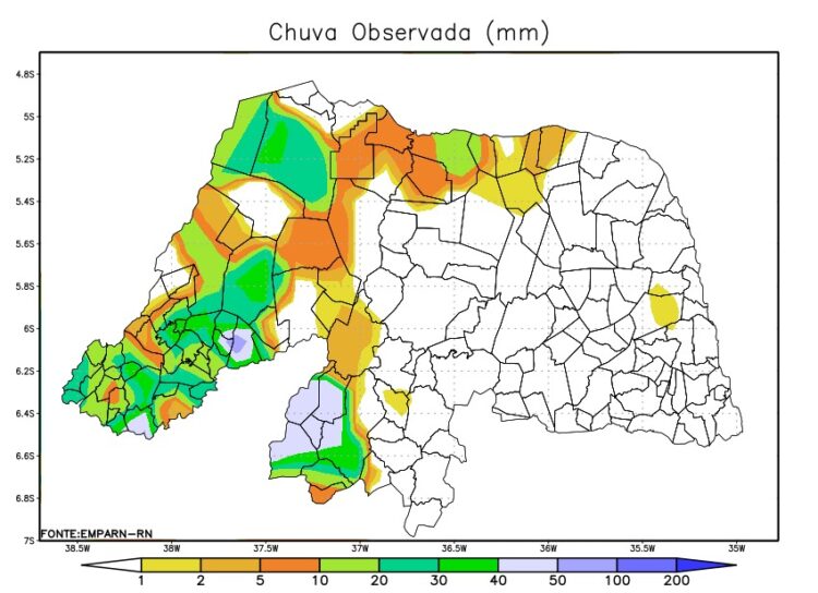 A Empresa de Pesquisa Agropecuária (Emparn) registrou a ocorrência de chuvas em 59 estações de monitoramento. As de maior intensidade foram em Rafael Godeiro, com 95,0 milímetros; Portalegre 68,0; Rafael Fernandes 66,5, Tenente Ananias 52,0 e Mossoró 48,0.