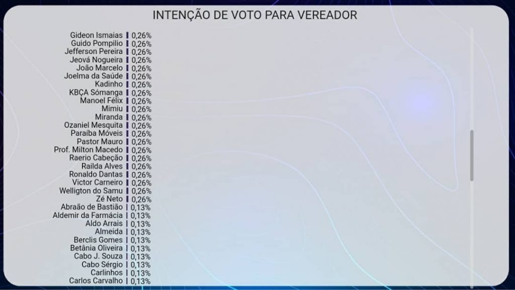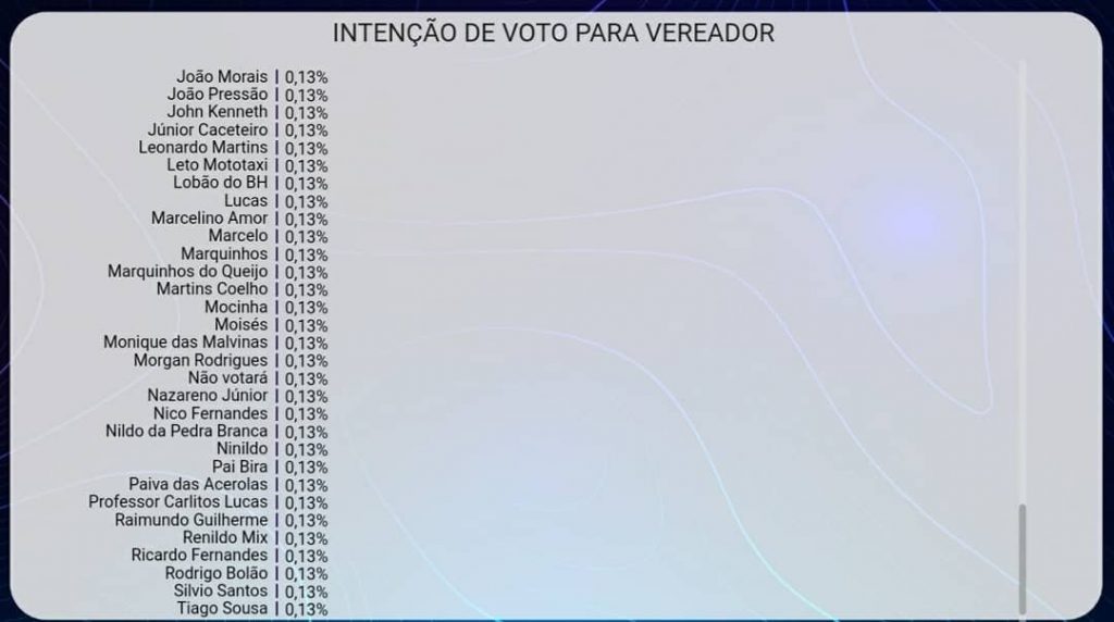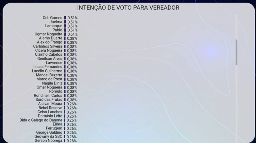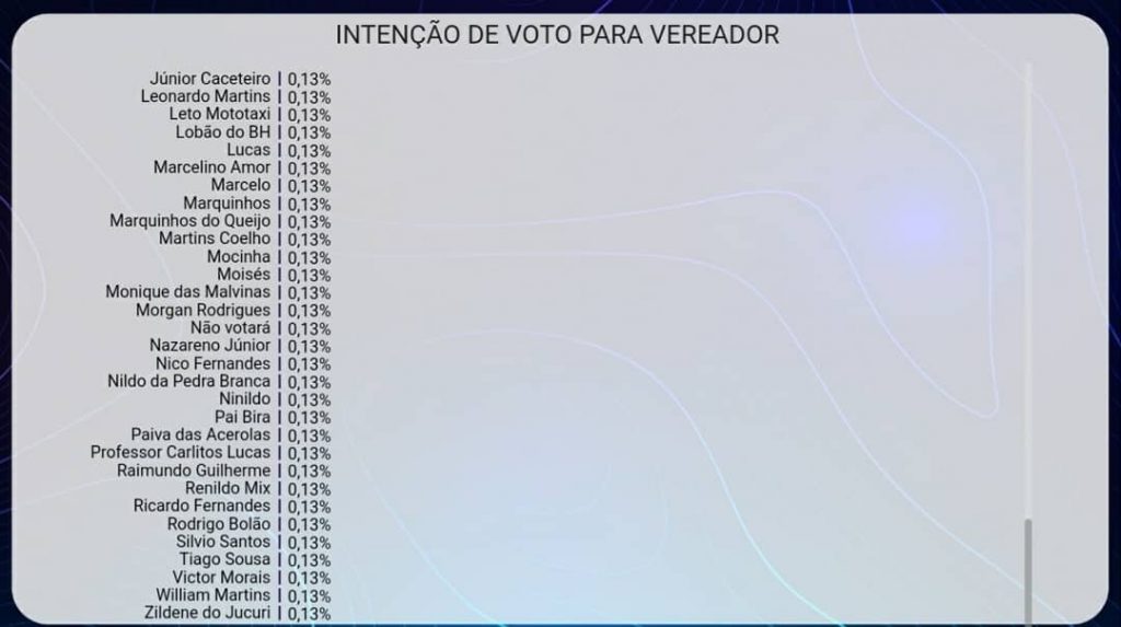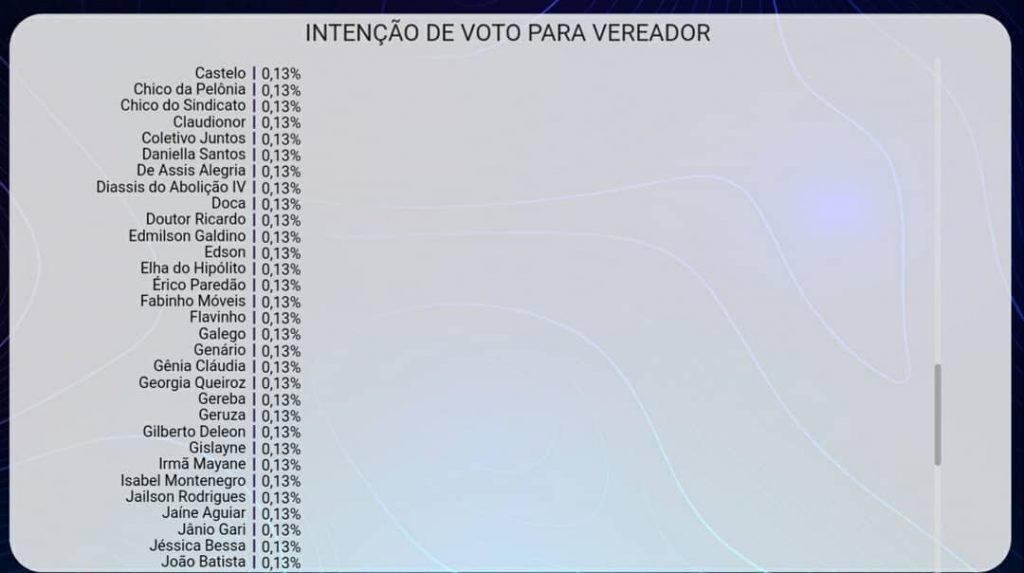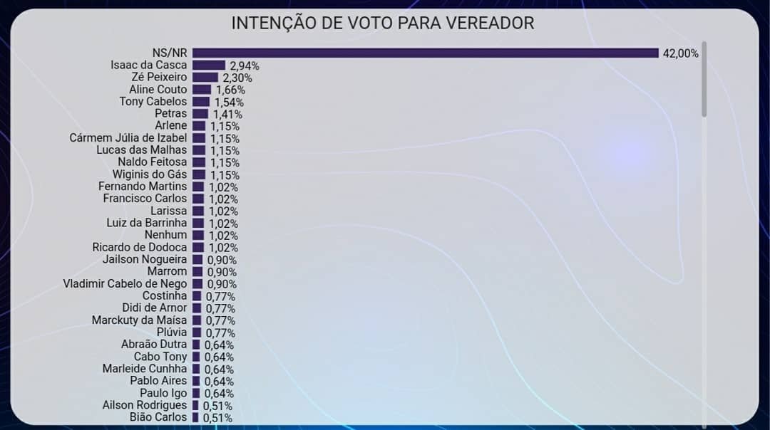 Abaixo os números da pesquisa do instituto TS2 Soluções contratada pela TCM Telecom com os números para a disputa por uma vaga na Câmara Municipal.