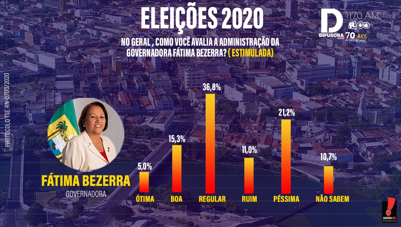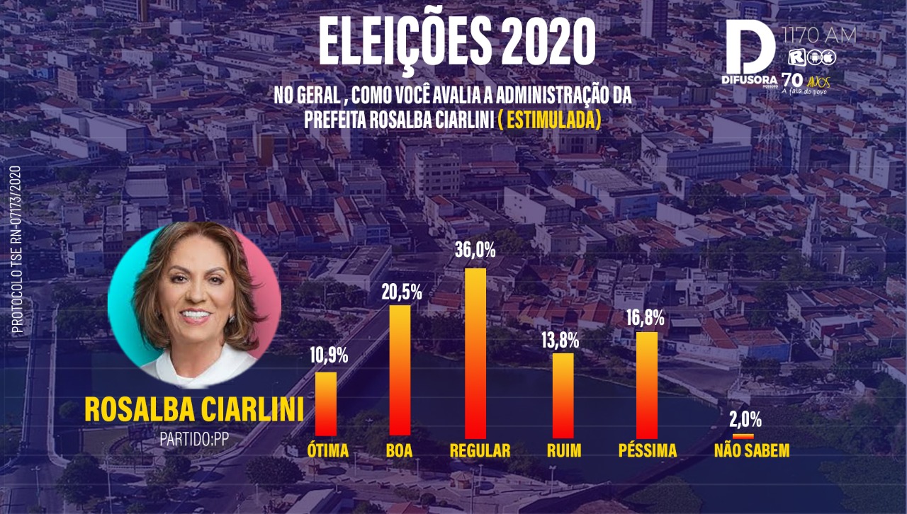 A pesquisa entrevistou 600 eleitores nos dias 7 e 8 de novembro. A margem de erro é 3,9 pontos percentuais para mais ou para menos com intervalo de confiança de 95%. O protocolo na Justiça Eleitoral é o RN-07173/2020.