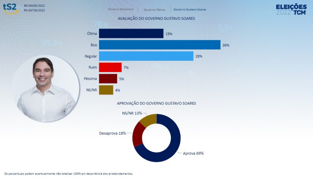O melhor desempenho é do prefeito Gustavo Soares (PL) que tem 69% de aprovação e um ótimo/bom de 55%. Já o presidente Jair Bolsonaro (PL) tem 64% de desaprovação e um ruim/péssimo de 60%.