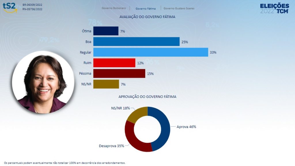A governadora Fátima Bezerra (PT) tem 46% de aprovação e 35% de desaprovação com divisão na avalição com ótimo/bom de 32%, 33% de regular e 27% de ruim/péssimo.