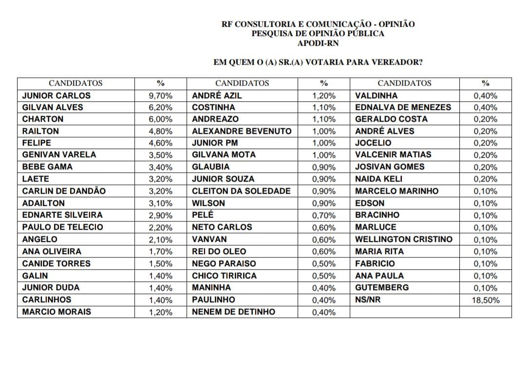 Abaixo os números do Instituto Instituto RF Consultoria & Comunicação para a Câmara Municipal de Apodi.